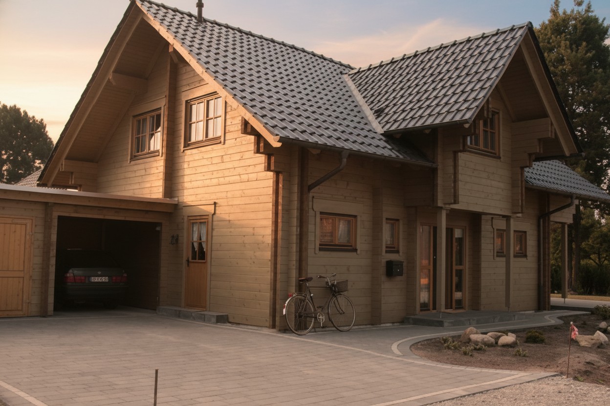 Sellises vahvas 160 m2 majas elab perekond Põhja- Saksamaal. Maja eripärase ilme annab vintskapiga katus ja otsaseinas paiknev terrass ja rõdu. Sakslastele omaselt soovivad nad olla uuenduslikud, keskkonda säästvad, efektiivsed ja kokkuhoidlikud. Puit on taastuv ehitusmaterjal, seega keskkonda säästev, kahekordsest 95mm freespalgist toodetud ja soojustatud välissein on hästi soojapidav. Siia juurde kuuluvad veel nägusad kolmekordse klaaspaketiga puituksed ja aknad. Sooja toob majja maasoojuspump ja õhuvahetust kontrollib soojatagastusega õhuvaheti. Sellega saavutati atraktiivne, ökoloogiline ja energiasäästlik kodu.