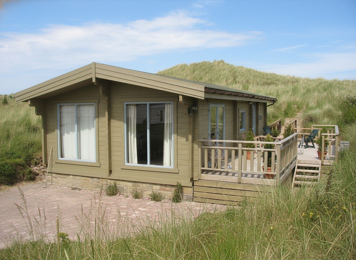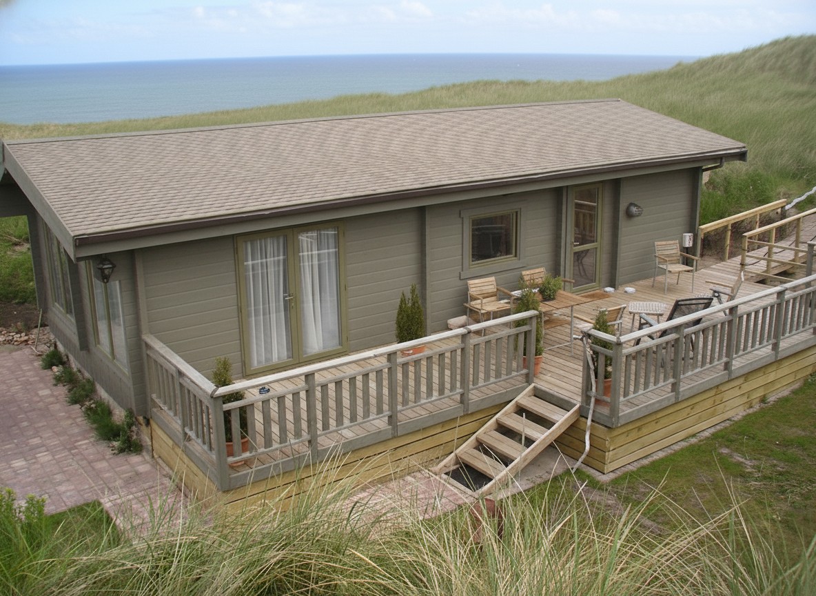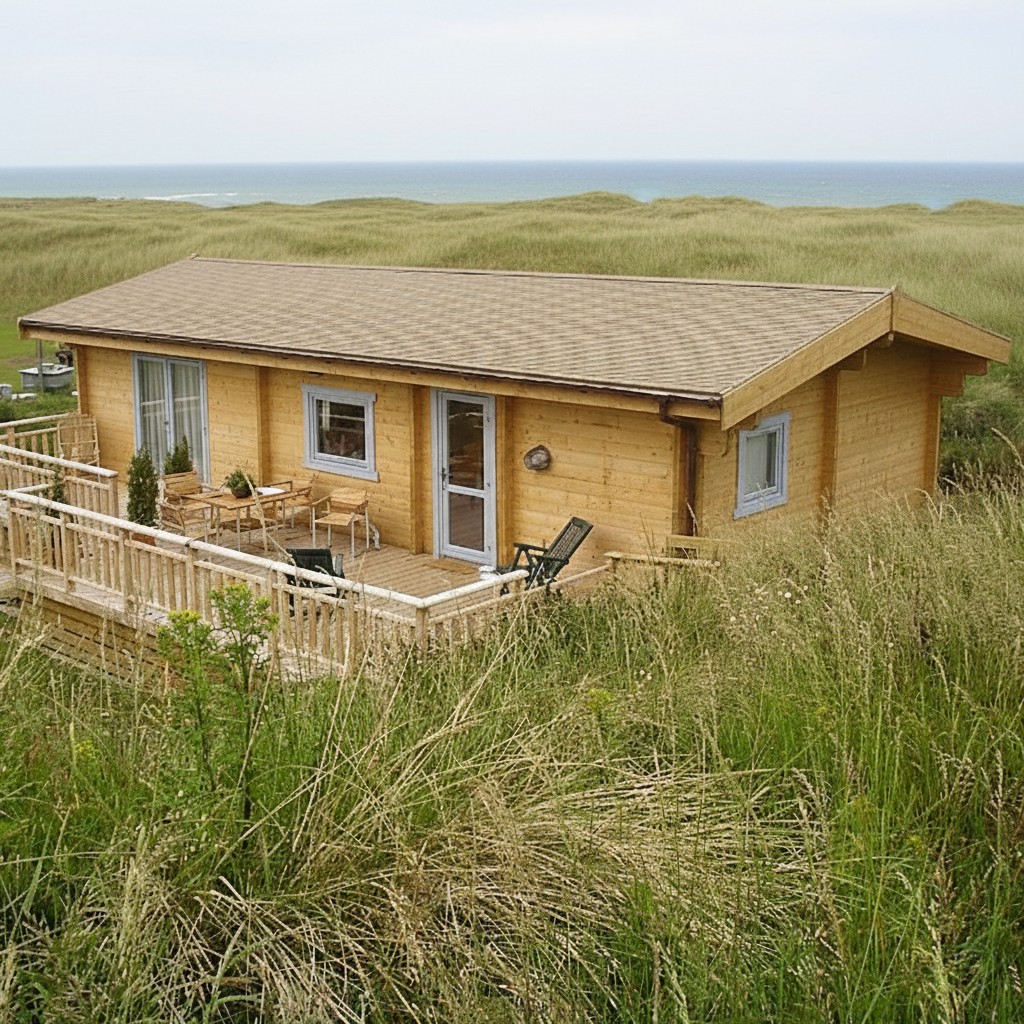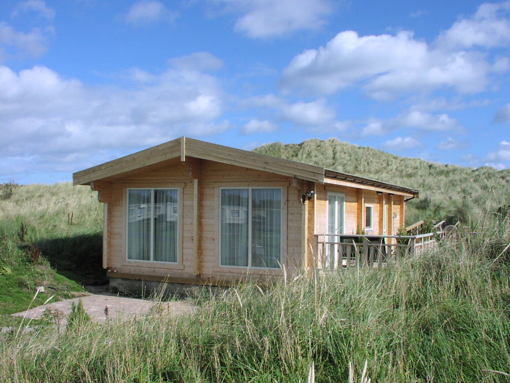 We created a holiday home in the dunes with a terrace and a private path to the beach. You can rent this building in the North East of UK and get a feeling for how great it is to live in a log home. Designed to suite the British caravan act.